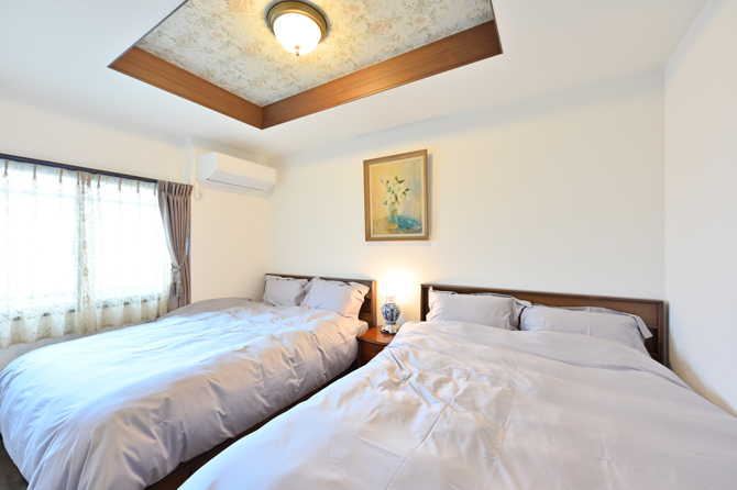 | 特徴 | ①デジタルキー ②ツインベッド(ダブルベッド×2台) ③システムキッチン(ガスコンロ) ④空気清浄機(脱臭機) ⑤エアコン 4基 ⑥大型冷蔵庫 ⑦食卓テーブル ⑧シャワートイレ ⑨TVモニター付きインターホン ⑩ドラム式洗濯機 ⑪お箸 ⑫タオル(フェイスタオル・バスタオル)