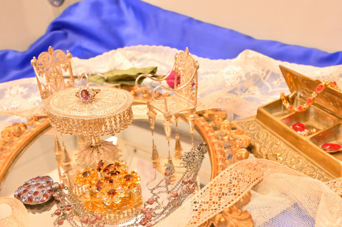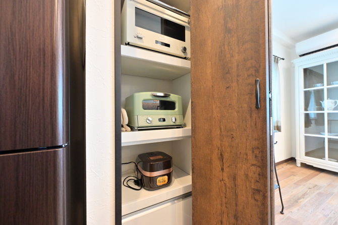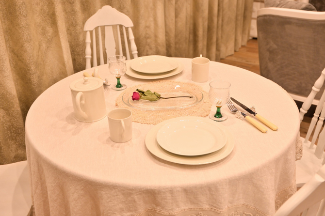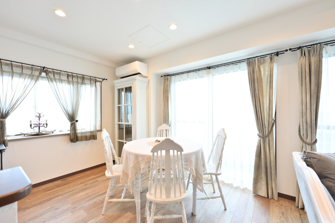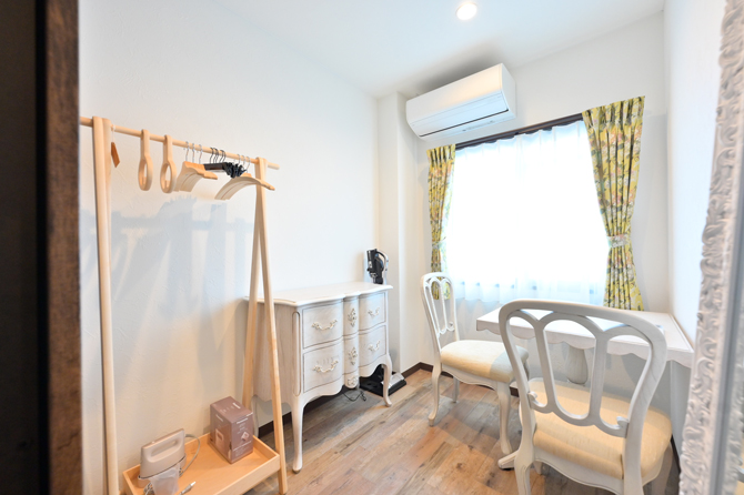 こちらのお部屋のシャンデリア・ジュエリー・ドールズファニチャー・マーガレットが描かれた絵画、ミラー・タオルハンガーは、すべて1920年頃のフレンチ・アンティークです。窓際のアンティークテーブルランプと有田焼のナイトランプの幻想的な煌めきが、夜毎、素敵な夢へと誘ってくれます。キッチンには、日本が誇る高級磁器やキッチンツールを取り揃えています。