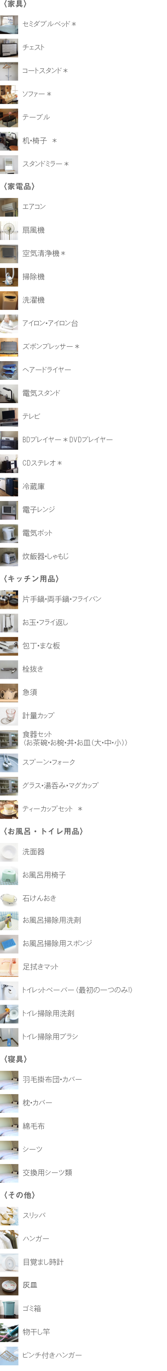 ●シャンプー・リンス・石けん・食器洗浄用洗剤・スポンジ・トイレットペーパー等の消耗品および歯ブラシ・タオル等の衛生品類は、お客様にてご用意ください。