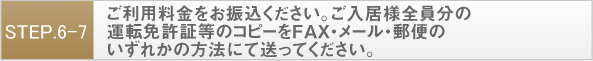 ご予約確定後3日以内に、お申込金をお振込ください。ご入居者様全員分の免許証等のコピーをFAX・メール・郵便のいずれかの方法にて送ってください。